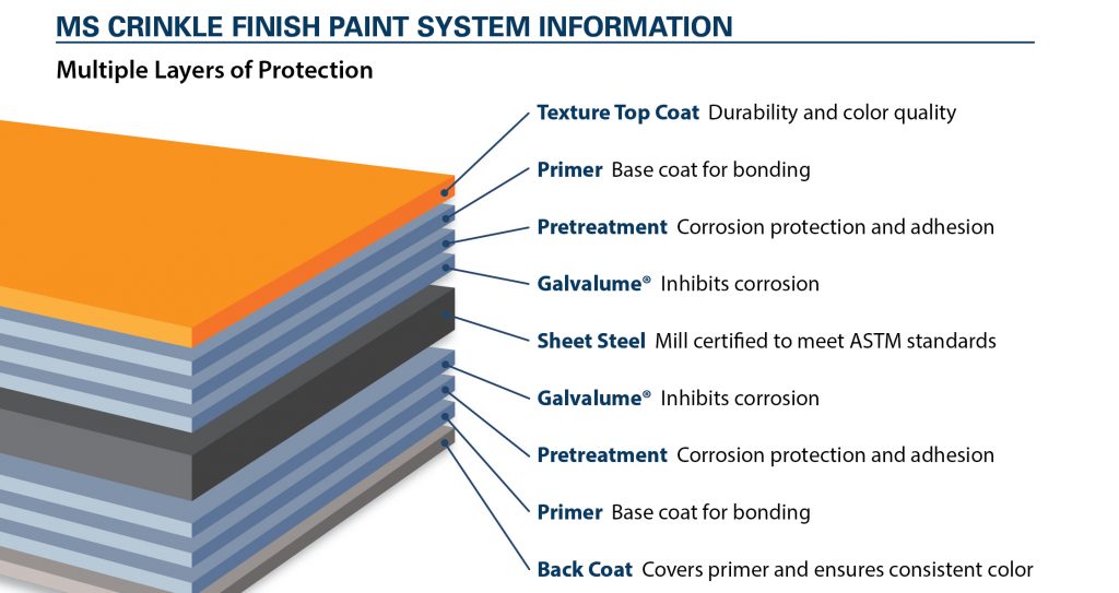 Formulated with enhanced silicone polyester, MS Crinkle Finish offers enhanced weatherability to resist fading, scratching and chalking. Combine that with the superior sales and technical support you have come to expect from Metal Sales and you have a building envelope that will last for decades and decades.